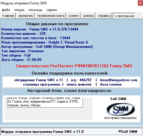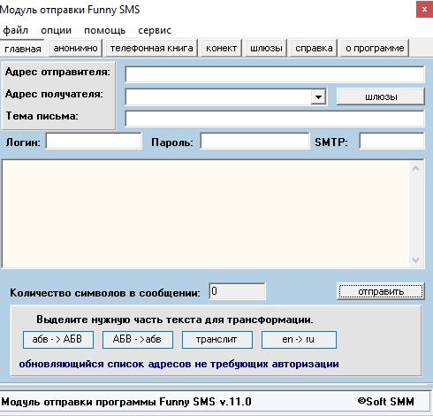 Программа позволяет генерировать весёлые сообщения которых наличие более 13.000 с шансом отправки сообщения на смартфон, пейджеры, почтовые ящики Gmail. В одной программе вы сможете наблюдать прикольные SMS поздравления любовные пошлые весёлые розыгрыши обломы и афоризмы. Каждый раз обновляется список СМС. Теперь вы сможете не тратить время и быстро найти нужную вам SMS и отправить друзьями или подруге с помощью нажатия одной кнопки.