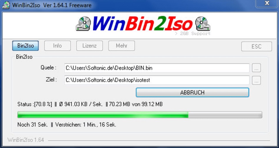 Программа предназначена для преобразования диска с расширением Бин в формат ISO. Поддерживается файлы с более 2 Гб. Не требуется установка.