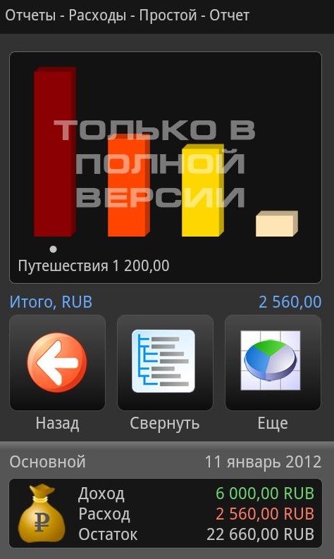 - Приложение предоставляет различные отчеты, включая отчеты по расходам и доходам за период.