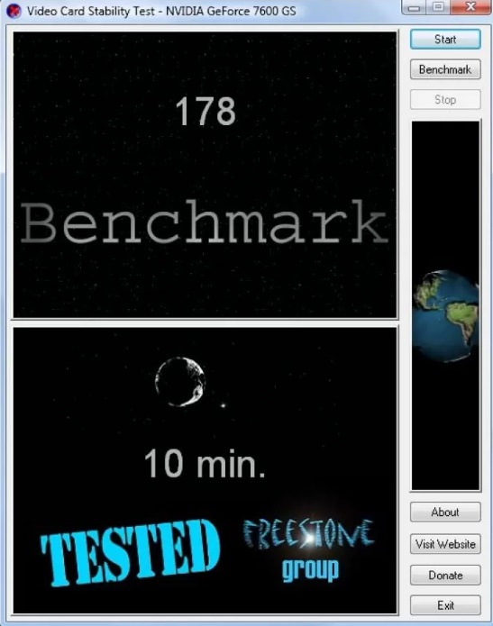 Во время тестирования Video Card Stability Test использует трехмерный показ вращающейся Земли в качестве графического объекта. По завершении теста программа выводит окно с результатами, где пользователь может посмотреть показатели производительности графического процессора и сравнить их с показателями других видеокарт.