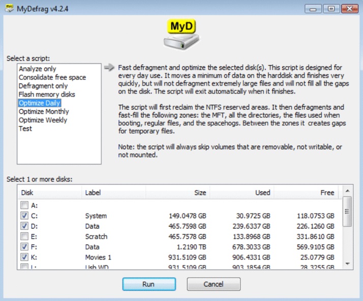 - MyDefrag предлагает два различных алгоритма дефрагментации, которые можно выбрать в зависимости от потребностей и предпочтений пользователя.