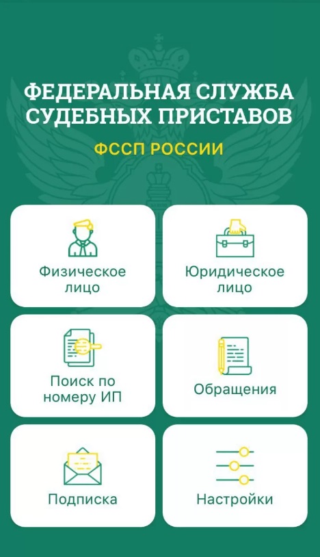 ФССП (Федеральная служба судебных приставов России) разработала официальное мобильное приложение, которое предоставляет пользователю доступ к базе данных исполнительных производств.