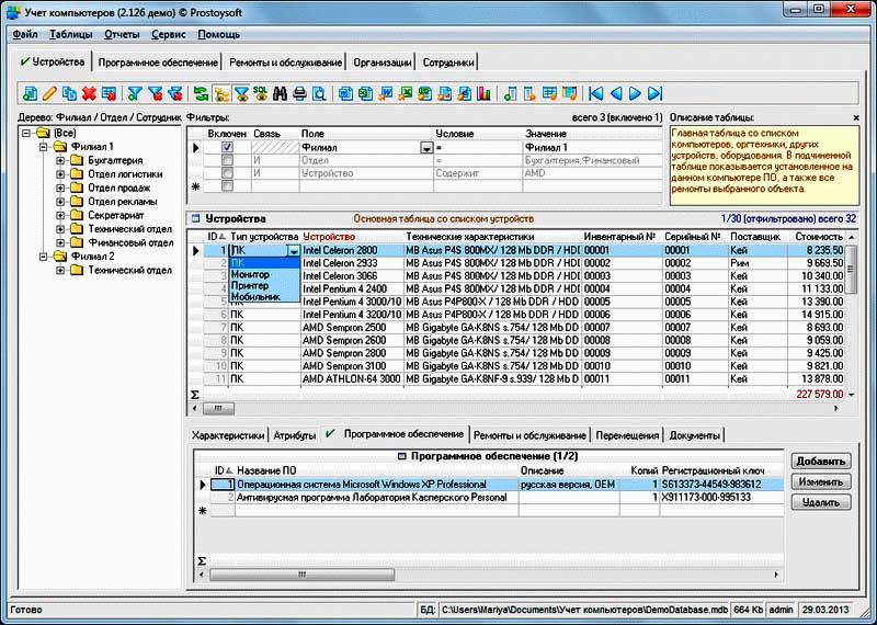 С помощью программы "Учет компьютеров" можно отслеживать производимые ремонты, замены расходных материалов и компонентов, проведение профилактических работ и установленное программное обеспечение. Вы можете использовать готовые таблицы и создавать собственные таблицы по своим требованиям. Программа также позволяет создавать пользовательские поля, включая вычисляемые поля с формулами типа SELECT, а также поля для хранения изображений. Вы можете генерировать документы на основе шаблонов и отправлять электронные письма.