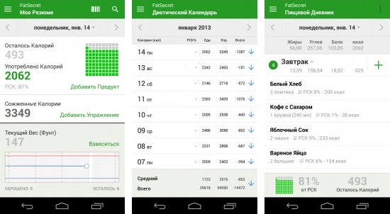 FatSecret создает графические отчеты о продуктах, потребляемых калориях и физических нагрузках.