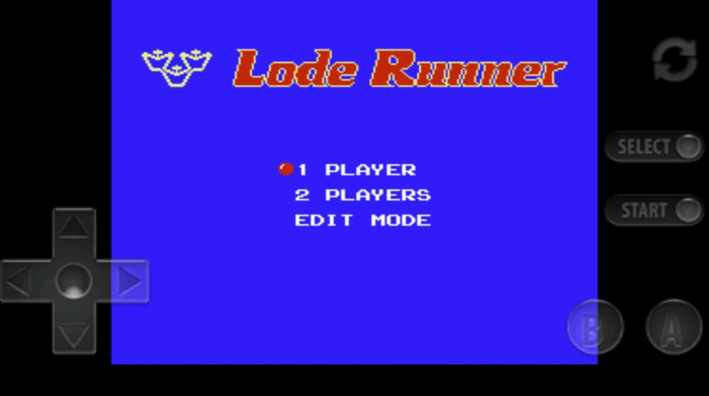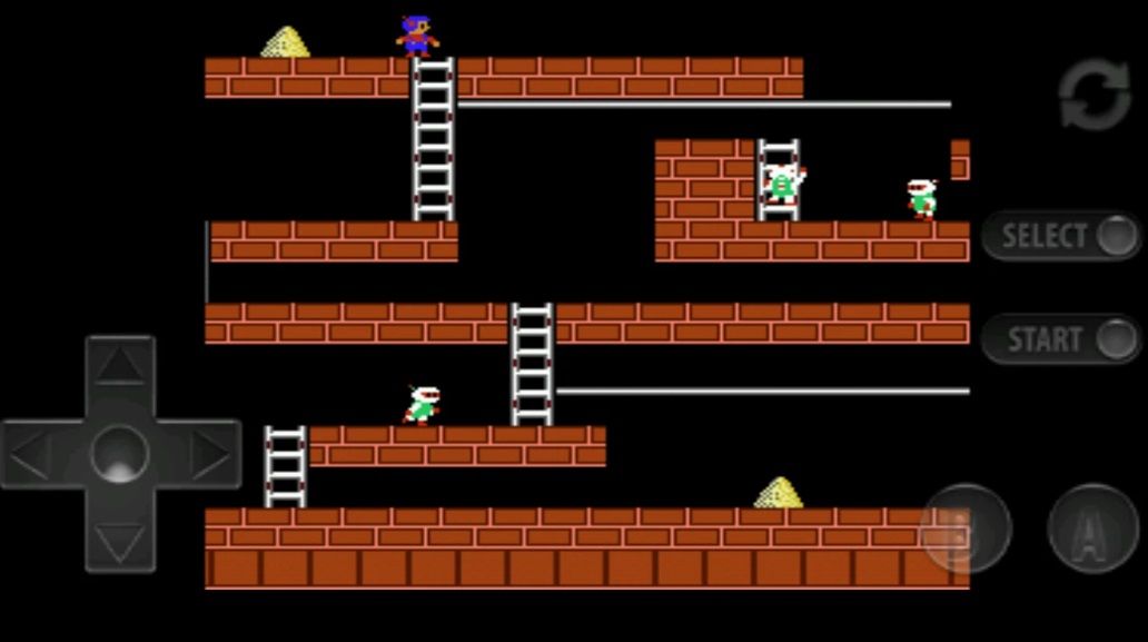 Управление в Lode Runner аналогично тому, что вы видели в Game Boy или Nintendo DS. Джойстик направления расположен на одной стороне экрана, а кнопки A и B - на другой. Кроме того, на экране есть кнопки "Старт", "Выбрать" и кнопка, возвращающая вас на главный экран, расположенная слева.