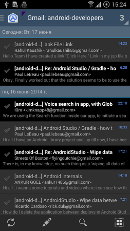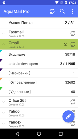 На главном экране Aqua Mail сразу видно все функции приложения. Вы можете организовать свои папки и метки для удобного хранения и поиска сообщений. Просмотр и поиск сообщений осуществляется тоже легко.