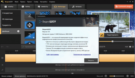 Наличие встроенной библиотеки с огромным ассортиментом готовых видеоэффектов, переходов, шаблонов и звуковых дорожек является основным преимуществом «ВидеоШОУ». Это позволяет быстро и просто создавать различные виды видео, от презентаций для компании до музыкальных клипов или слайд-шоу.