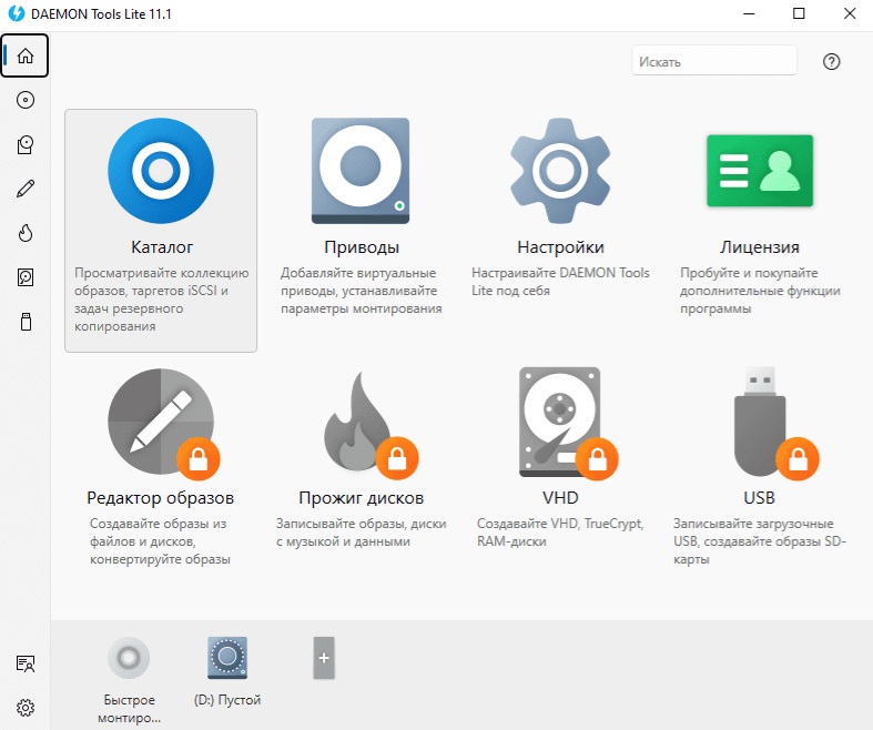 Интерфейс программы Демон Тулс довольно прост. Lite-версия не так давно приобрела рабочее окно. Настройки программы позволят вам отправить ее в нижний угол, включить/отключить автозапуск и автоматического монтирования образов.