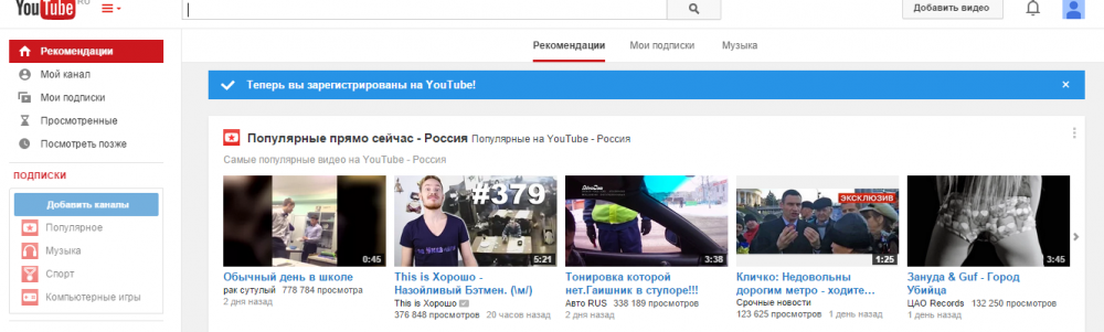 Зайдите в почту и пройдите по ссылке из письма. После успешного прохождения по ссылке откроется главная страница YouTube, которая будет выглядеть так.