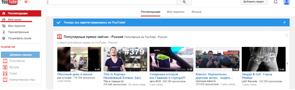 Вы стали пользователем YouTube. Теперь осталось создать свой канал. Для этого в левом верхнем углу найдите надпись "Мой канал" и нажмите на нее.