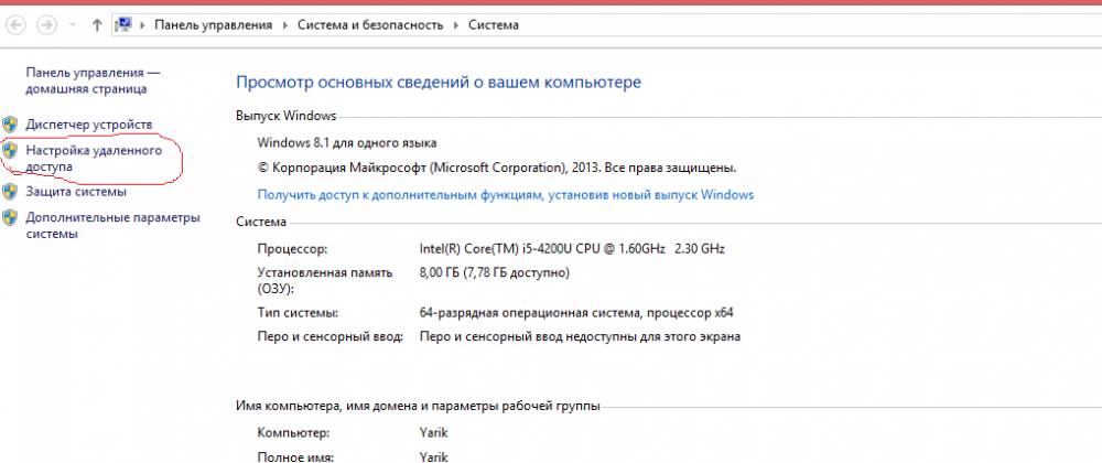 Для того чтобы включить на свой компьютер, который работает на ОС Windows 8 Pro, удаленный доступ, нужно сделать несколько действий. Для начала найдите значок компьютера на рабочем столе или в меню "Пуск" и кликните по нему правой кнопкой мыши. В новом окне выберите пункт "Свойства". После этого вы попадете в меню "Просмотр основных сведений о вашем компьютере". Здесь ищите и нажимайте на пункт "Настройка удаленного доступа".