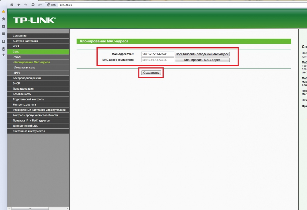 И последний шаг - клонирование МАС адреса. Заходим в меню «Сеть», выбираем подпункт «Клонирование МАС адреса» и следуем инструкции: