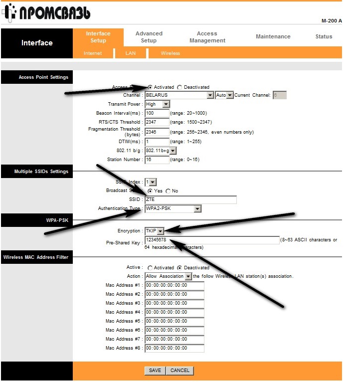 В поле «Pre-SharedKey» придумайте и запомните пароль, который вы хотите установить на ваш Wi-Fi. В поле «SSID»напишите отображаемое имя вашего WI-Fi (не желательно использовать русские буквы при заполнении данного поля).