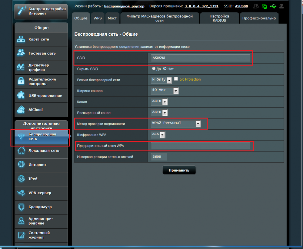 Для настройки Wi-Fi на данной модели роутера, вам нужно перейти на вкладку «Беспроводная сеть». В этой вкладке, выберите «Общее» и укажите там некоторые данные. SSDI – имя вашей сети, можете ввести любое название на латинице. «Метод проверки подлинности» - выбирает только WPA2-Personal, «Предварительный ключ WPA» - это пароль для вашей сети, укажите какой вам угодно, но не меньше 8 символов и нажмите «Принять».