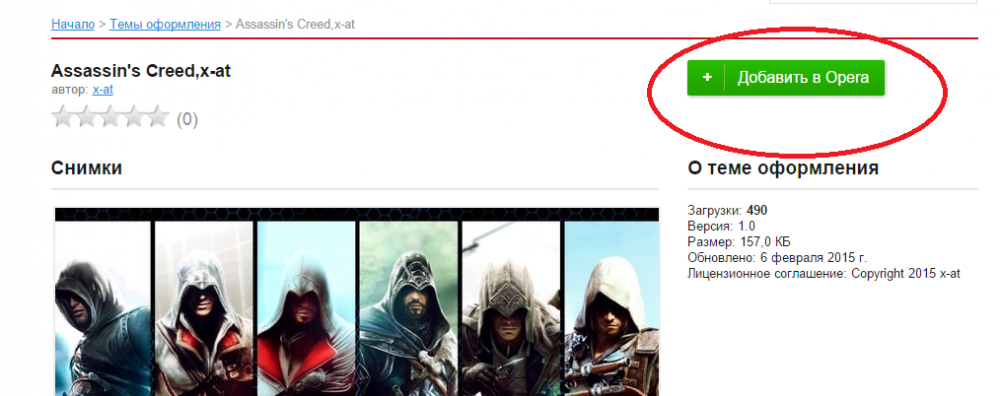 После того как вы нажмете на нужную тему вы попадете в новое окно, в котором нужно будет выбрать и нажать на пункт "Добавить в Opera". Начнется недолгая установка. После установки в вашем браузере Opera появится данная тема.